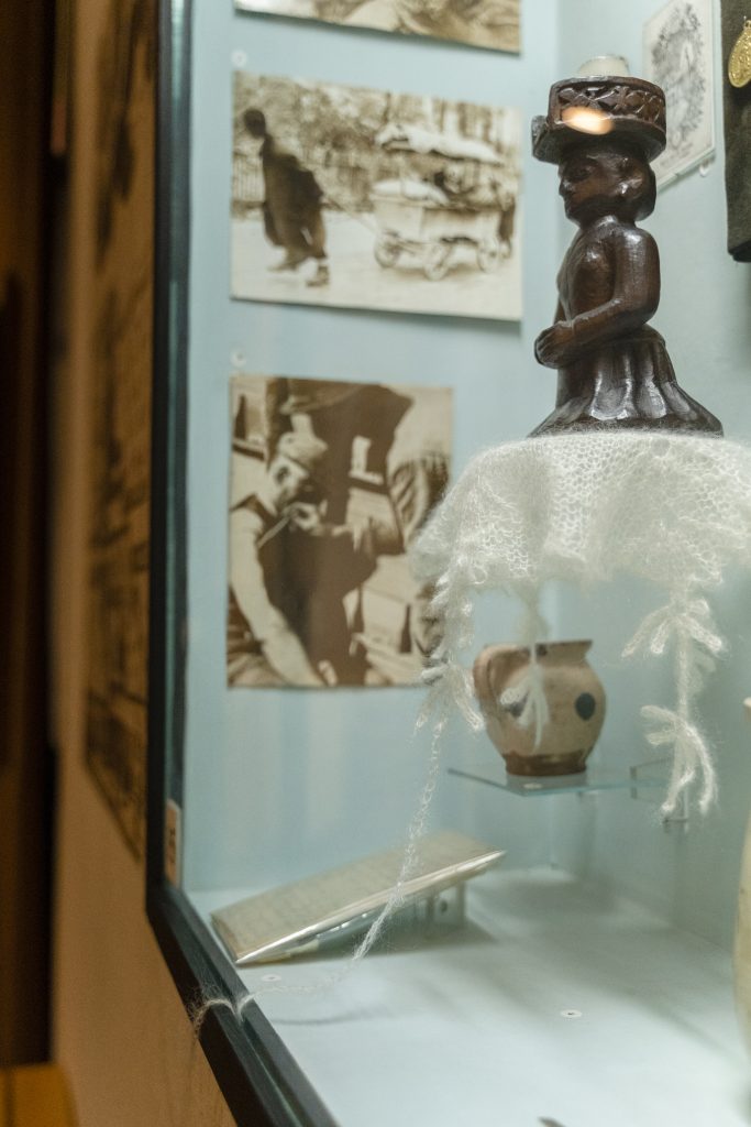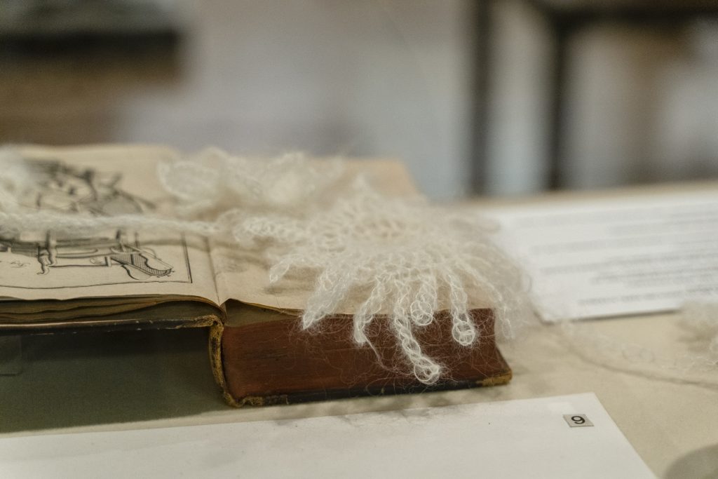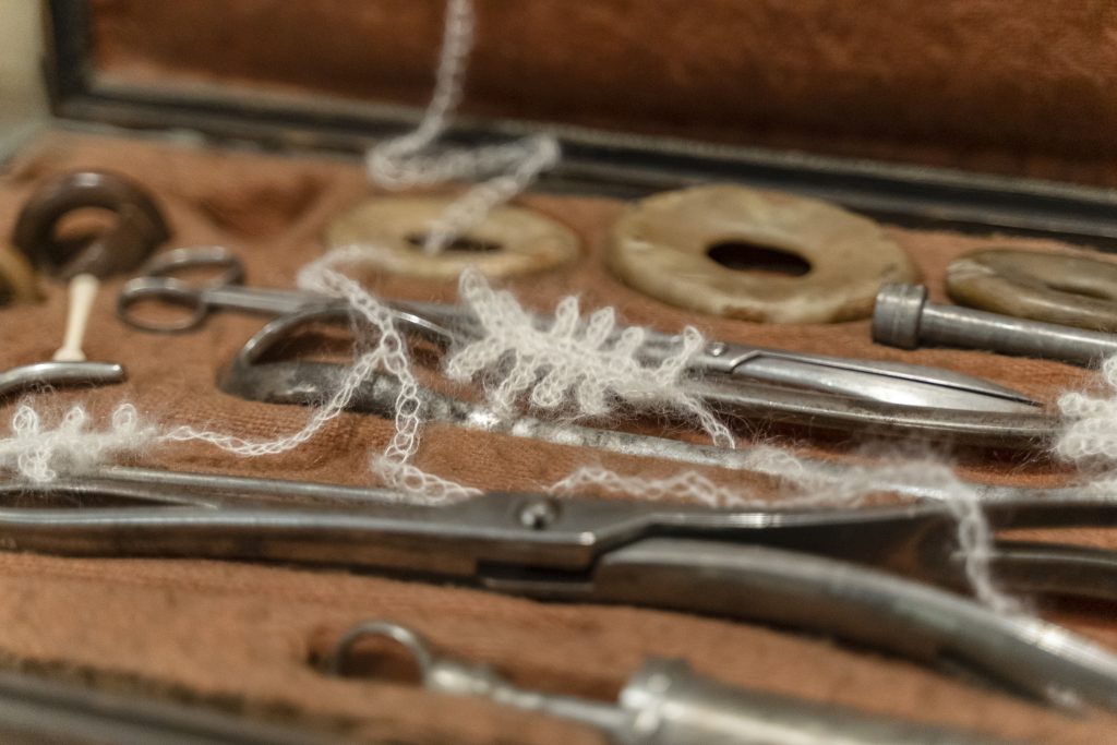 The installation reflects on the specifically female knowledge around birth (an indisputably female capacity) that has become a profession over the centuries through midwives’ dedicated work. An enquiry into the Hungarian history of midwifery makes it clear that despite continuous attacks, midwife-led care has managed to survive and still has committed representatives who strive to raise the status of their profession within the larger domain of maternity care. The installation is a subtle yet poignant intervention that employs its chosen technique, materials, and motifs to try and grasp the web-like, often outcast form of knowledge that midwifery is. Crocheted and knitted from mohair and silk, its patterns were inspired by the herbs whose Hungarian name contains the word ‘bába’ (midwife): bábaguzsaly (horse-tail) and bábakalács (carline thistle). Ethnographer Vilmos Voigt notes that medical books from the 16th to 18th centuries seem to have completely omitted any reference to the midwife; the word ‘bába’ appears only as a prefix in the name of herbs.